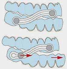 justierbare Vorverlagerung des Unterkiefers, die je nach Schweregrad des Schnarchens bestimmbar ist, eine Öffnung der hinteren Atemwege. Die Atemluft kann wieder ungehindert zirkulieren und das